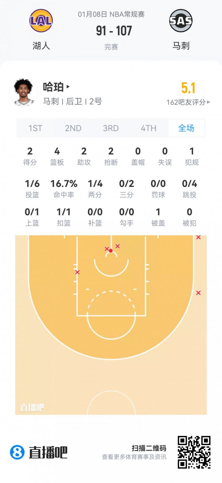 马刺首轮14号秀卡特·布莱恩特 登场4.5分钟